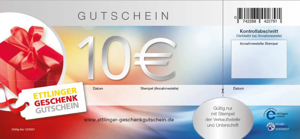 Über 60 Ettlinger Einzelhändler, Dienstleister, Restaurants, Kultur- und Freizeiteinrichtungen sind als Annahmestellen des Ettlinger Geschenkgutscheins (PDF, 203 KB) mit im Boot und bieten sowohl dem Schenkenden als auch dem Beschenkten eine breite Auswahl und Vielfalt. Ob Schwimmbad, Kino, Restaurant, Modehaus, Schuhgeschäft, Apotheke, Buchhandlung oder Freizeitspaß, der Gutschein erfüllt fast jeden Wunsch und unterstützt zeitgleich lokale Betriebe.
