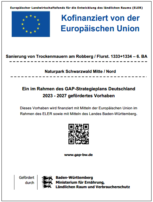 Die Sanierung der Trockenmauern auf den städtischen Grundstücken am "Weißen Häusle" konnte auf Antrag durch die Stadt Ettlingen im Rahmen des Förderprogramms "Naturpark Schwarzwald Mitte / Nord" vom Land Baden-Württemberg bezuschusst und von der Europäischen Union im Rahmen des Europäischen Landwirtschaftsfonds für die Entwicklung des ländlichen Raums (ELER) kofinanziert werden.