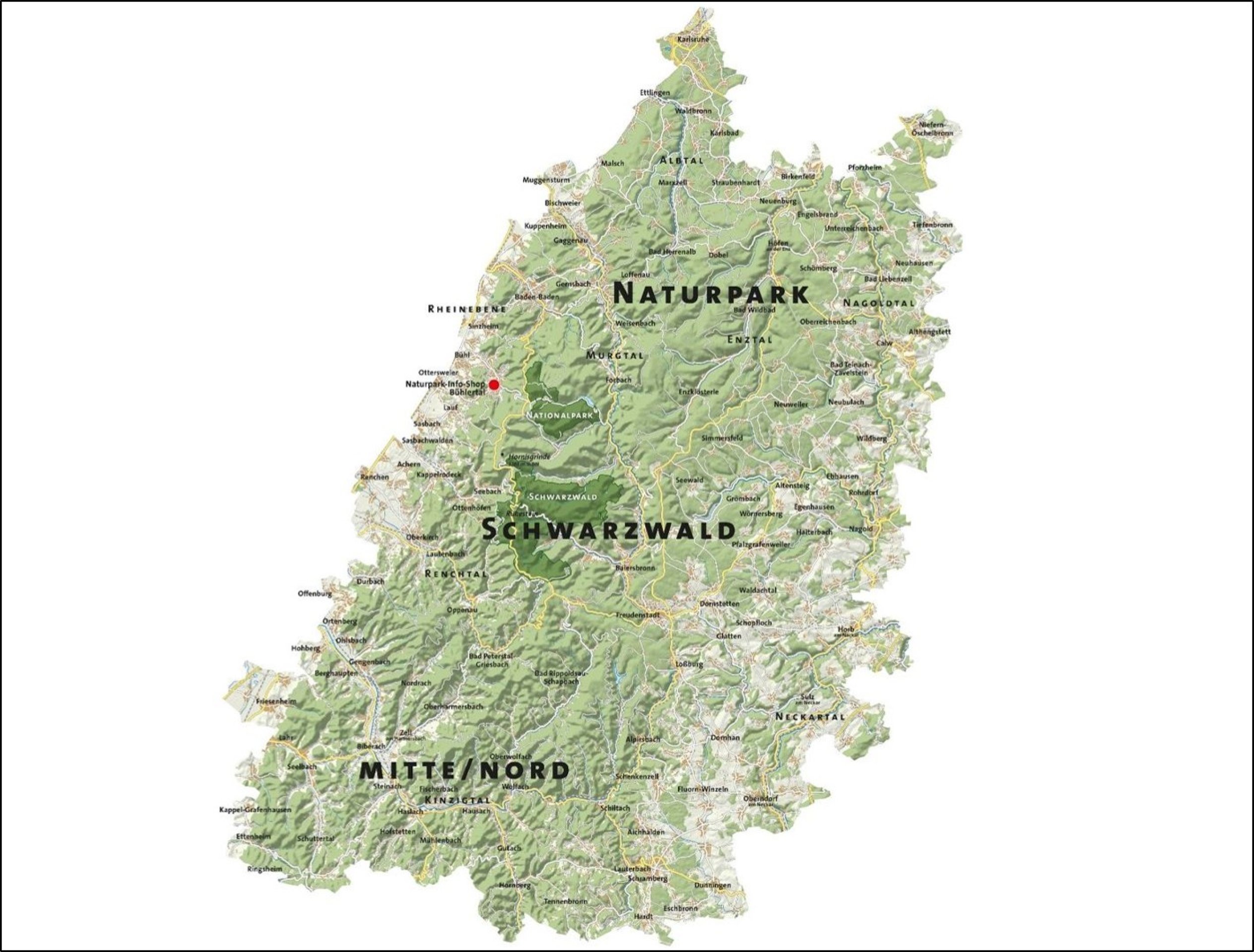 Der NATURPARK SCHWARZWALD Mitte/Nord reicht von der Stadt Karlsruhe im Norden bis zur südlichen Grenze des Ortenaukreises im Mittleren Schwarzwald. Die Abgrenzung umschließt dabei im Wesentlichen den Naturraum Schwarzwald. Insgesamt befinden sich sieben Landkreise (Karlsruhe, Rastatt, Ortenaukreis, Freudenstadt, Rottweil, Calw, Enzkreis), drei Stadtkreise (Baden-Baden, Pforzheim, Karlsruhe) und 114 Gemeinden und Städte im Naturpark Schwarzwald Mitte/Nord. Er ist ein Naturpark der Superlative: Seine längste Nord-Süd-Ausdehnung beträgt 90 km, seine größte Breite ca. 65 km. Und mit rund 420.000 Hektar Fläche und 800.000 Einwohner ist er der größte Naturpark Deutschlands.