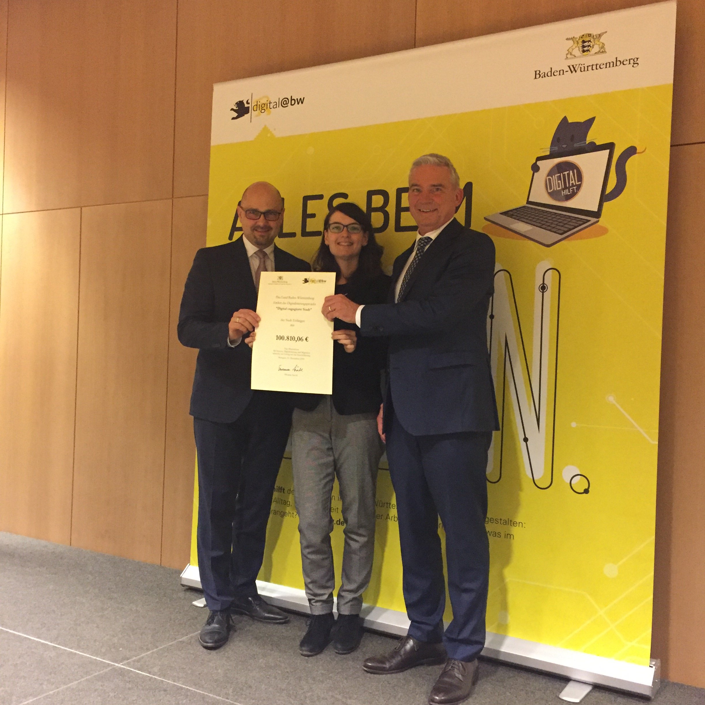 Am Dienstag, 10.12.2019, reiste Oberbürgermeister Johannes Arnold stellvertretend für die drei Städte Ettlingen, Baden-Baden und Bretten nach Stuttgart, um die Auszeichnung der Landesregierung für kommunale Digitalisierungsprojekte im Zuge des Förderwettbewerbs „Gemeinden, Städte und Landkreise 4.0 – Future Communities 2019“ von Innen- und Digitalminister Thomas Strobl entgegen zu nehmen. Der Antrag für die Förderung erfolgte im Rahmen der Interkommunalen Zusammenarbeit re@di - regional.digital*.
