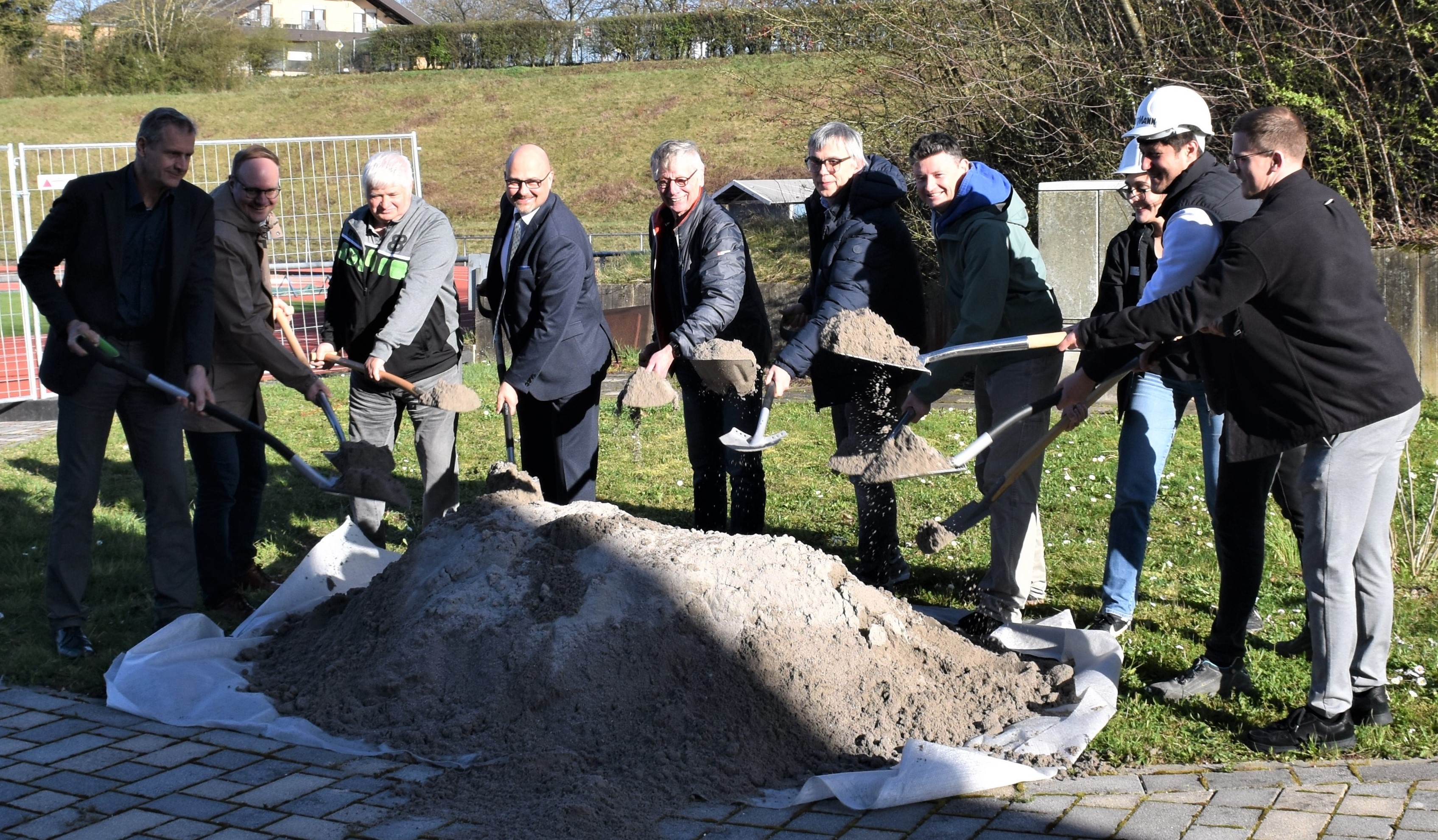 Gleich zwei Baustarts mit dem Spaten gab es am Donnerstag vergangener Woche: einerseits für das Lager am Hans-Bretz-Stadion und andererseits für den künftigen Kunstrasenplatz anstelle des ‚Knochenbrecherplatzes‘, wie der Hartplatz mitunter bezeichnet wurde.