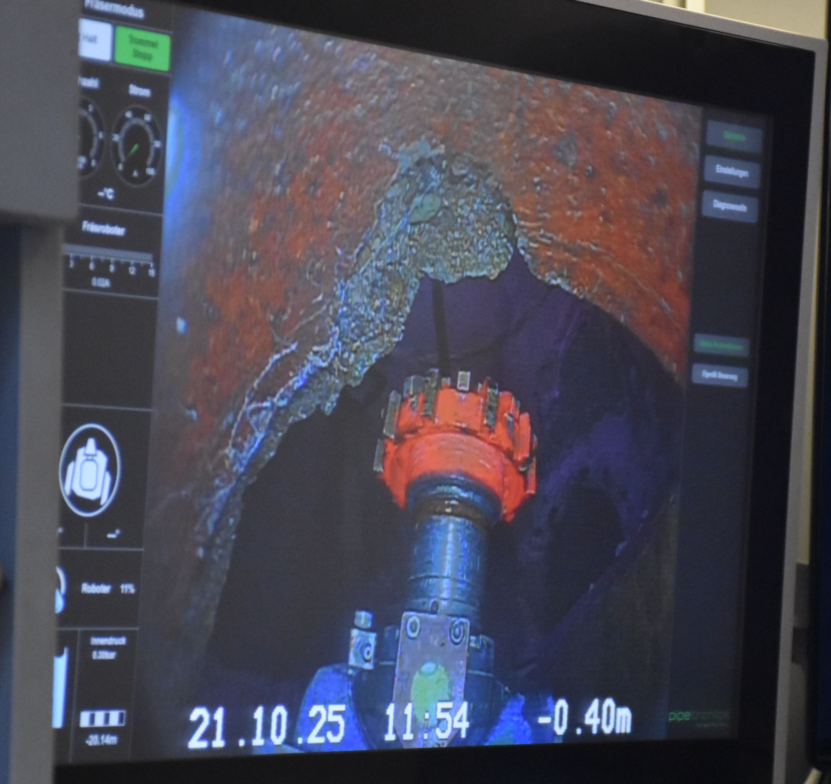 Erles-Mitarbeiter Philipp Hanl und Arsen Niemann ließen zu diesem Zweck einen Fräsroboter in die Kanalöffnung hinab; ausgestattet mit einem schwenkbaren Fräskopf und einer Kamera bewegt er sich entlang der Rohre, schleift alles ab, was den Inliner schädigen könnte, und dokumentiert zugleich die Arbeiten. Hat der Roboter sein Werk getan und ist die Sanierung mittels Schlauchliner abgeschlossen, folgt eine Abnahmeinspektion zur Kontrolle des Ergebnisses. Der obere Teil des Vogelsangwegs wird so ertüchtigt, hinzu kommen noch zwei Haltungen in der Steigenhohlstraße, die gleichfalls stark geschädigt sind.