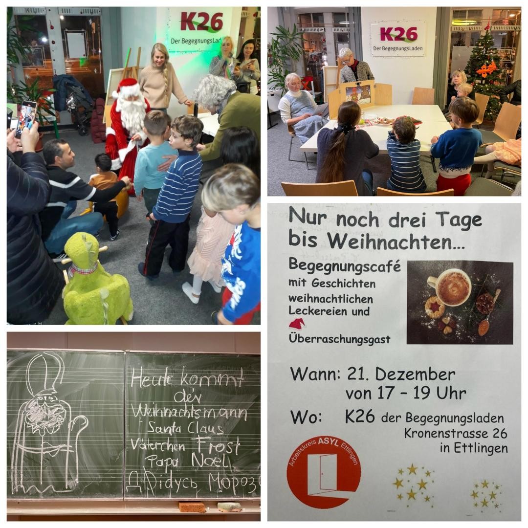 Ein paar Eindrücke von einem sehr bunten weihnachtlichen Begegnungscafé... Der Weihnachtsmann war zu Gast im K26 und hatte neben Geschenken auch tolle Lieder und sogar einen lustigen Tanz für alle Kinder mit im Gepäck! Am Basteltisch entstanden schöne Sterne, aufmerksam wurden Geschichten gelauscht und der gespendete Kuchen aus der Kleinen Kaffeeblüte schmeckte herrlich. Es war ein rundum gelungener Abend. Vielen Dank an alle Beteiligten und große und kleine Besucher*innen!